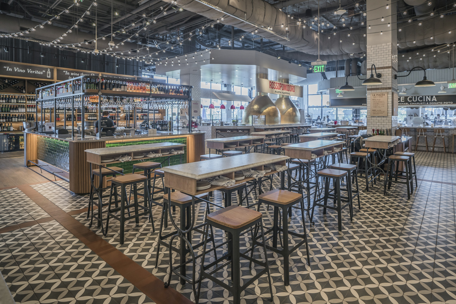Interior build-out of the Los Angeles location of an international food chain, Italian market and tasting rooms. The space houses four restaurants, multiple kitchens, nine take-away food stalls, an instructional culinary school, retail space, two chilled wine storage rooms, and a rooftop bar and restaurant with indoor and outdoor seating. The scope also included the construction of a back-of-house area with cold and dry storage, a small office space with a conference room, employee break rooms and locker rooms. Additional special features include two spiral staircases spanning multiple floors, and a grey water system with a two-story plant wall.