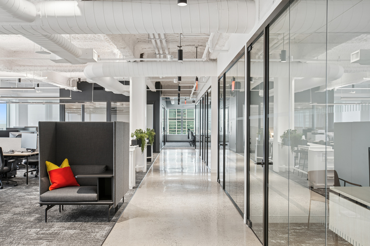 NBCUniveral’s Chicago broadcast hub consolidates four previously separate floors into one cohesive, high-performance environment designed to enhance efficiency, communication and coordination. Each zone was thoughtfully tailored to its division, with managers positioned near their teams to support faster decision-making. Inspired by the energy of 30 Rock, the open design features a refined industrial aesthetic with exposed ductwork and concealed conduits, while advanced BIM coordinatio ensured all systems aligned seamlessly for a polished, integrated result.
