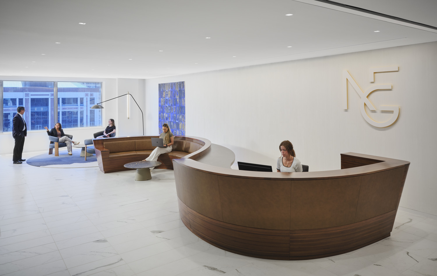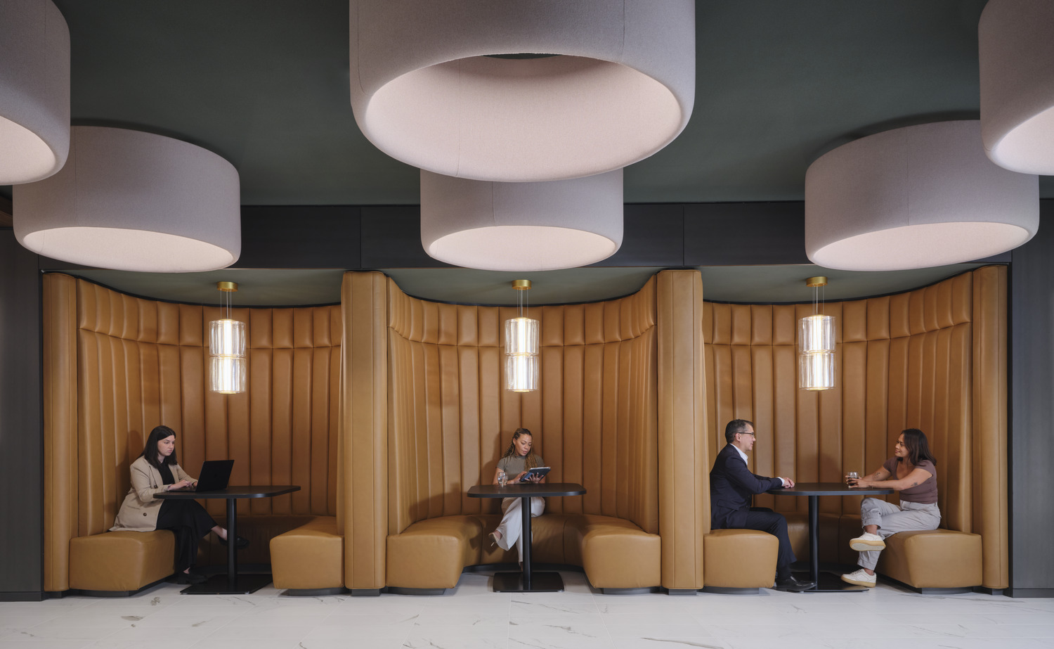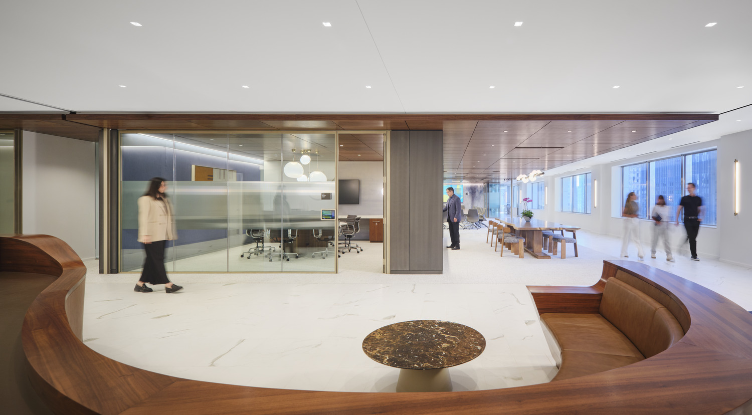 This three-floor transformation for Neal Gerber Eisenberg (NGE) spans floors 27 through 29 of The Bell at 225 West Randolph, creating Chicago’s first LEED Platinum-certified law office and positioning the firm as the city’s first zero-carbon law firm. Designed with a hospitality-first approach, the new workplace balances professional sophistication with warmth, featuring restorative amenities such as a speakeasy-inspired lounge, fireplace and a cafe known as “The Club,” offering a variety of seating to support both individual focus and collaboration.