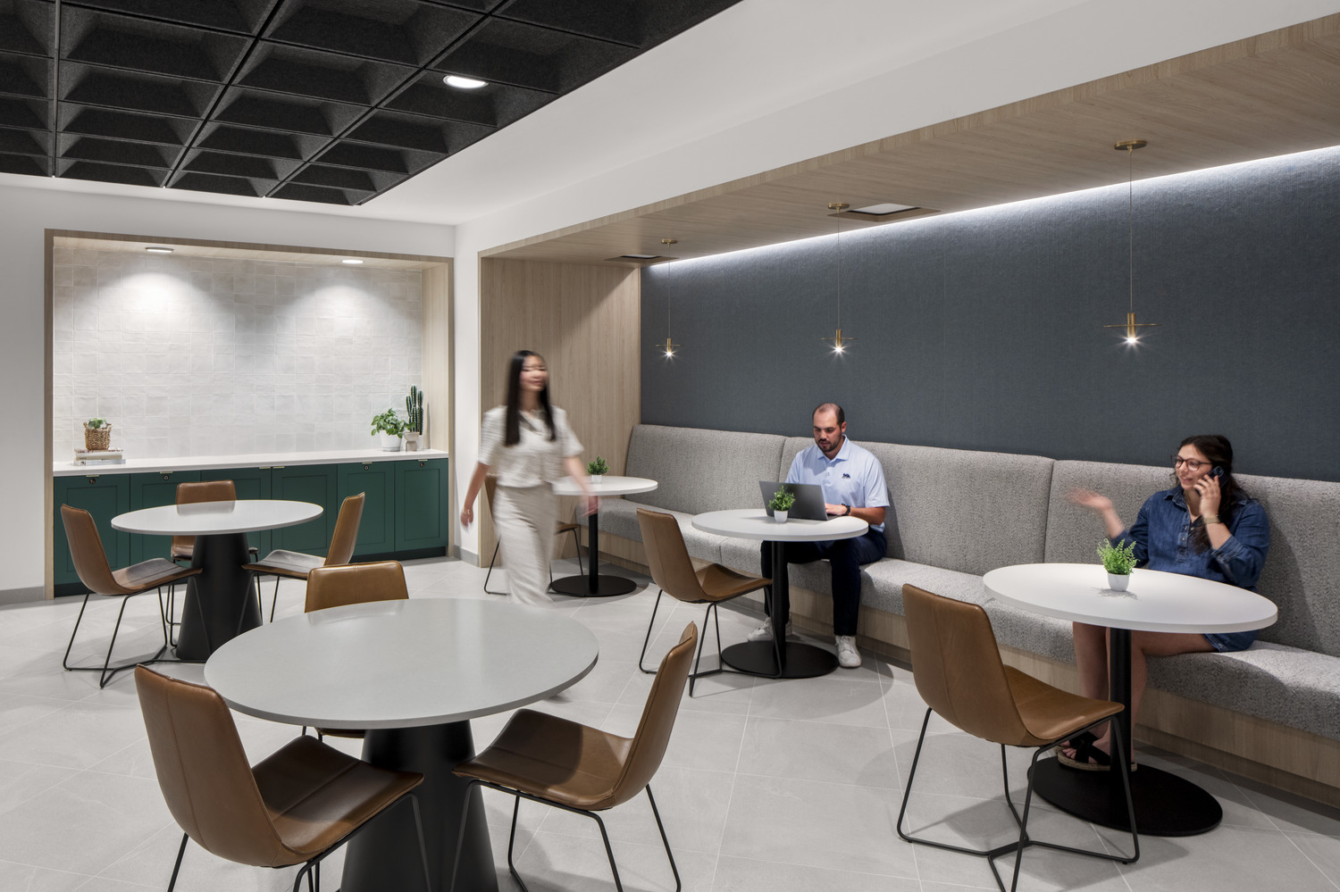 Material selections elevate the space throughout, with a thoughtful mix of carpet, ceramic tile and luxury vinyl tile flooring. Specialty ceiling systems paired with linear LED lighting and integrated mechanical registers reinforce a clean, modern aesthetic. A high-end millwork package anchors the experience, highlighted by custom banquette seating and detailed molding framing a vapor fireplace in the main reception area for a warm, hospitality-inspired arrival.