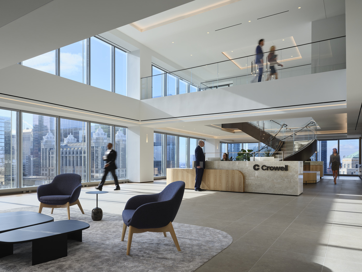 Located across two floors inside the 7 World Trade Center, this build-out for architecture firm Skidmore Owings & Merrill (SOM) fosters collaboration and community. The 60,000-square-foot space features extensive millwork, custom ceiling panels, advanced acoustical design, innovative lighting technologies, and an integrated shade control system. A wide opening at the center of two floors creates the “forum”—a dynamic space for gatherings and events. The floors are connected by a timber stair that leads directly into a shared cafe and lounge, as well as amenities for meditation, prayer, and breaks. Work areas are organized around collaboration zones, embodying the principles of openness, mobility, and teamwork. This project is LEED Gold and WELL certified.