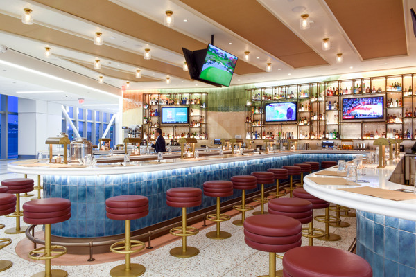 Interior build-out of a private lounge for business-class travelers, located in Terminal 2 of LAX. The lounge houses a kitchen, full-service bar, and VIP dining area. High-end finishes were used throughout the creative design, including indirect cove lighting, custom curved…